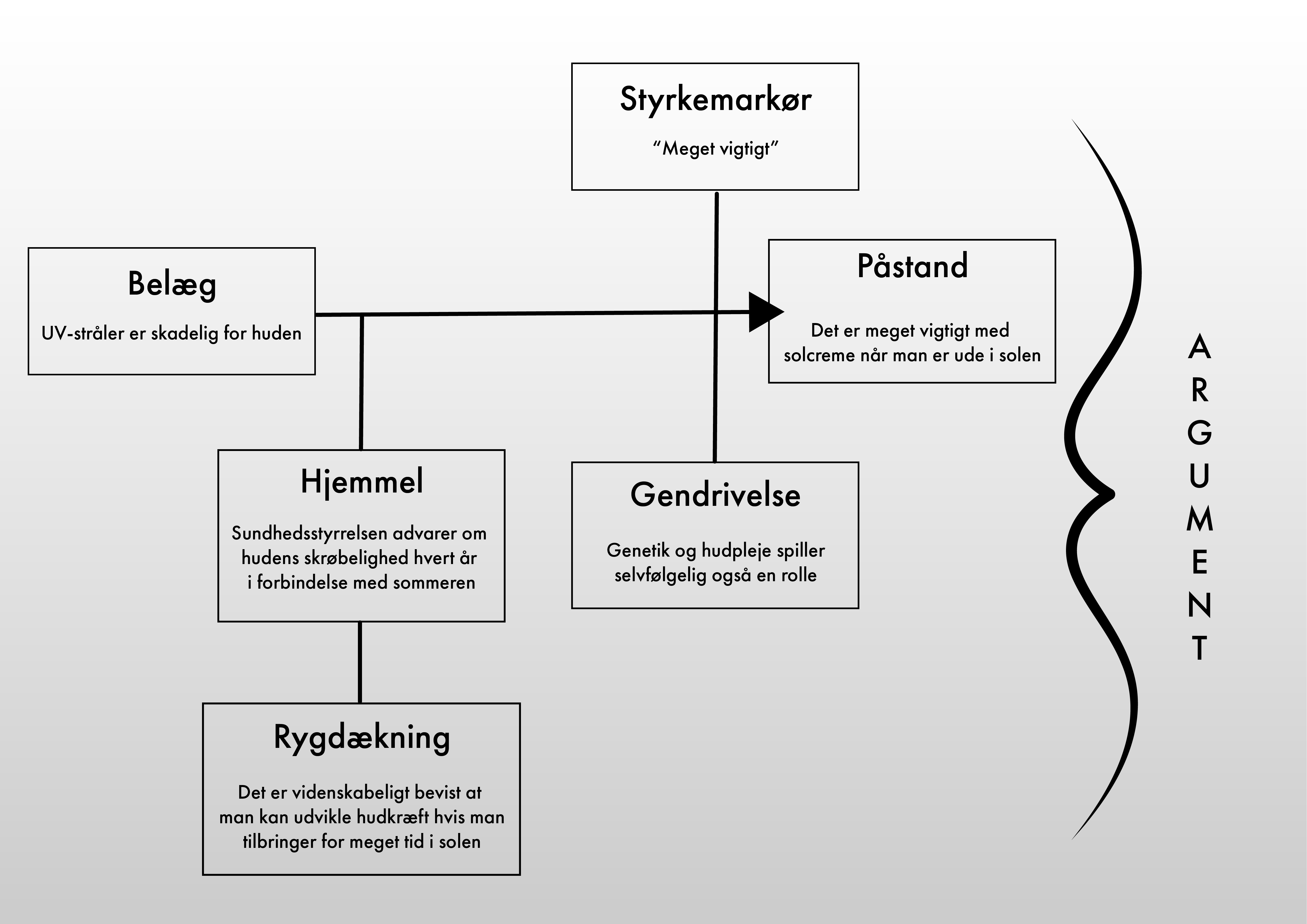 En god argumentation indeholder en påstand, et belæg og en hjemmel. Påstanden, er det afsender ønsker at overbevise modtageren om. Belægget, er begrundelsen for påstanden og hjemmel, er sammenhængen mellem påstand og belæg.